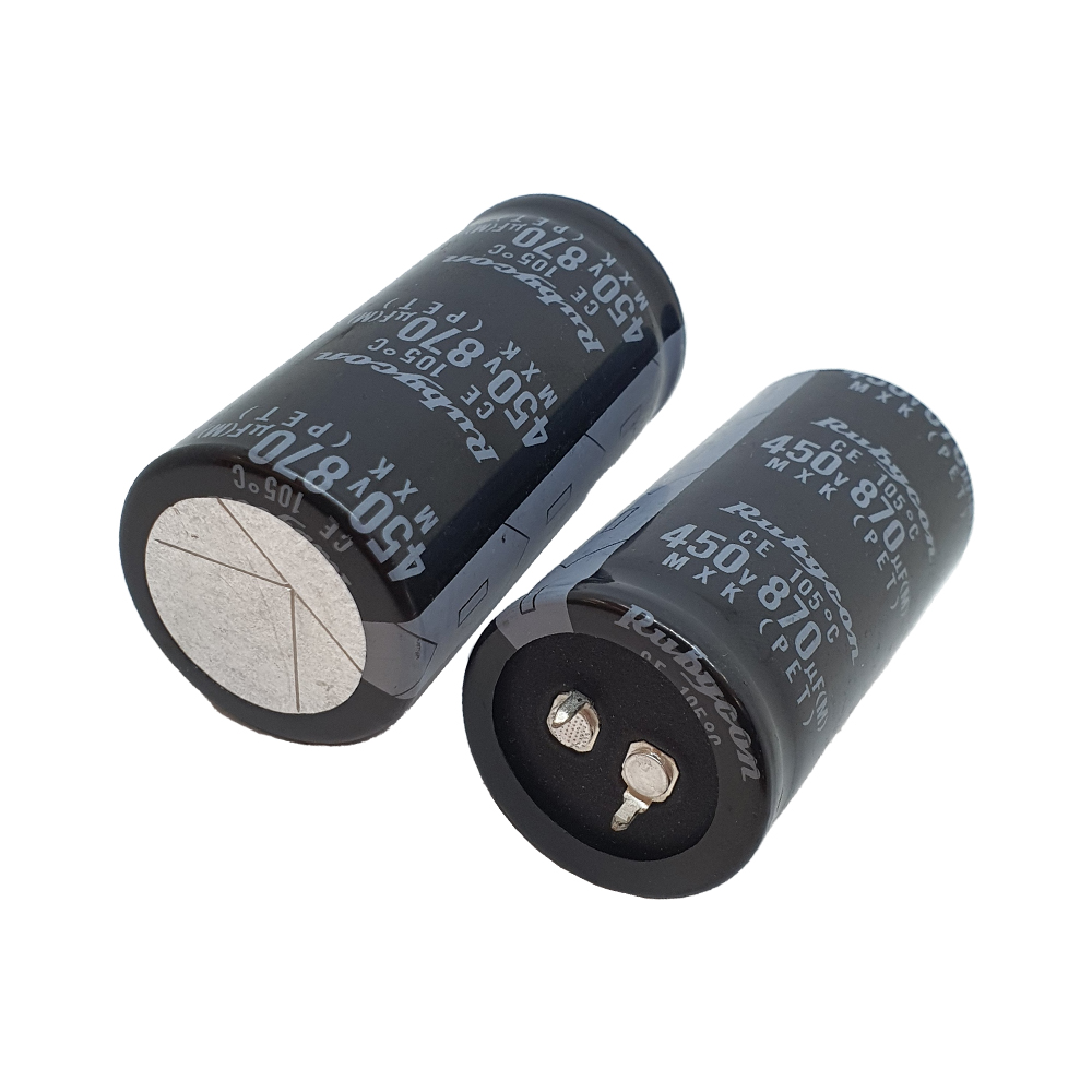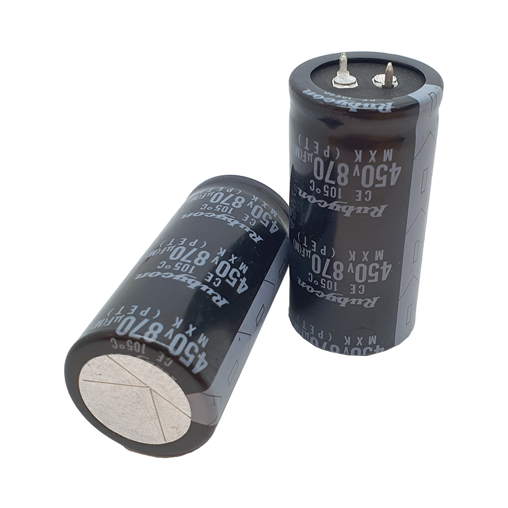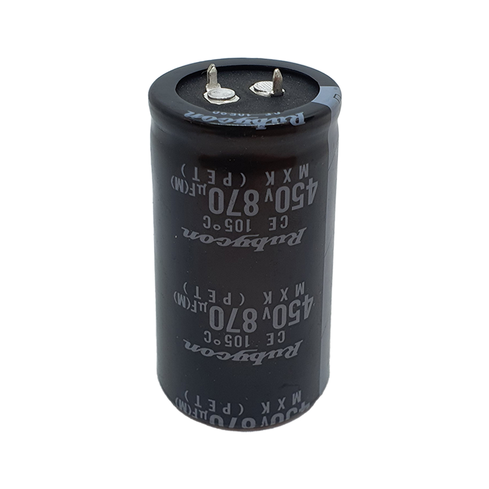 خازن الکترولیت 870 میکروفاراد با ولتاژ کاری 450 ولت و ابعاد 30x60 میلی متر برند RUBYCON