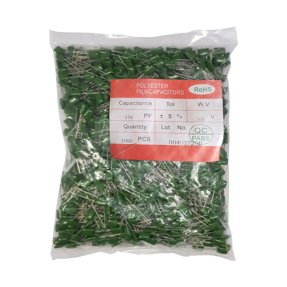 خازن پلیستر 154 ظرفیت 150 نانو فاراد 100 ولت با فاصله پایه 7.5 میلی متر