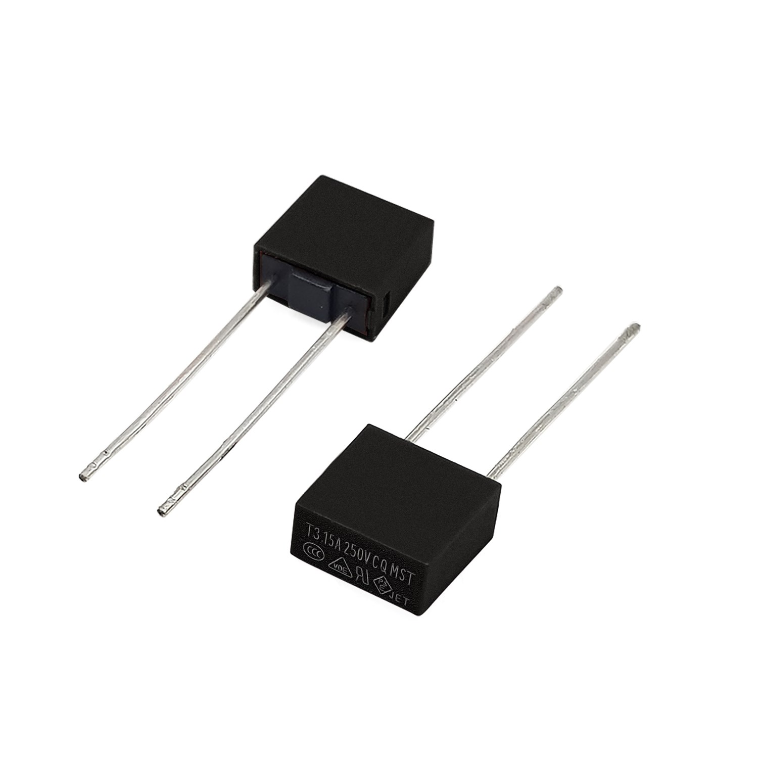 فیوز مینیاتوری MST از نوع تأخیری (Time-Lag Fuse) با پایههای رادیال است که برای حفاظت از مدار در فضاهای محدود طراحی شده است.