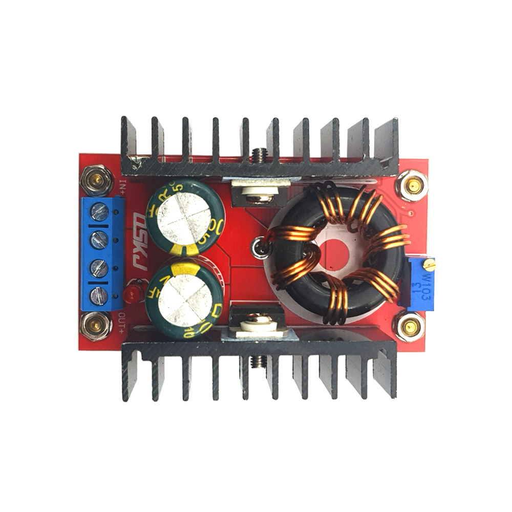 ماژول مبدل DC-DC افزاینده 150W یک مبدل DC-DC می باشد که از توپولوژی BOOST بهره می گیرد و توانایی افزایش ولتاژ را دارد، ولتاژ خروجی قابل تنظیم توسط پتانسیومتر مولتی ترن بوده و بازه ی ولتاژ خروجی بین 10 تا 32 ولت است.