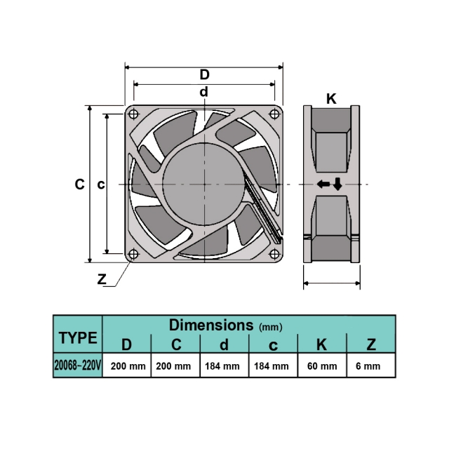 فن بلبرینگی 220 ولت با ابعاد 20x20 و ضخامت 6.8 سانتیمتر