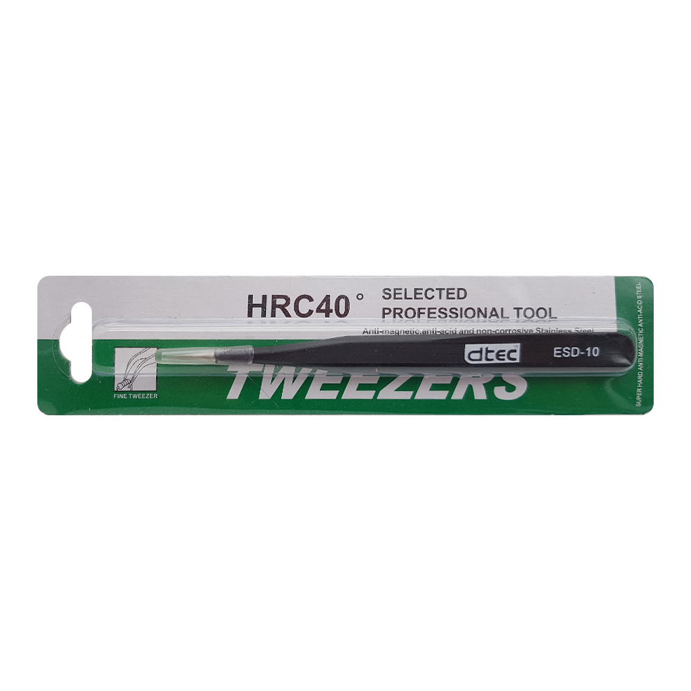 پنس ESD-10 با نوک سوزنی شکل با برند DTEC داری قابلیت ضد مغناطیسی و آنتی استاتیک، دارای مقاومت در برابر خورده شدن، ضد زنگ در اثر رطوبت، طراحی ارگونومی و مقاومت بالا برای گرفتن قطعات و اجسام ریز و ظریف از جملع قطعات الکترونیک SMD و DIP، نوک بسیار تیز و باریک،جنس بدنه فولاد آب دیده، طول 123 میلیمتر