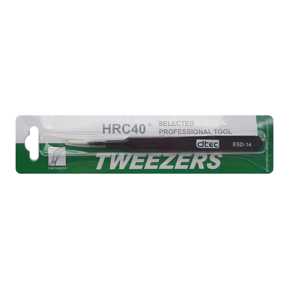 پنس ESD-14 با نوک سوزنی شکل با برند DTEC داری قابلیت ضد مغناطیسی و آنتی استاتیک، دارای مقاومت در برابر خورده شدن، ضد زنگ در اثر رطوبت، طراحی ارگونومی و مقاومت بالا برای گرفتن قطعات و اجسام ریز و ظریف از جملع قطعات الکترونیک SMD و DIP، نوک بسیار تیز و باریک،جنس بدنه فولاد آب دیده، طول 120 میلیمتر