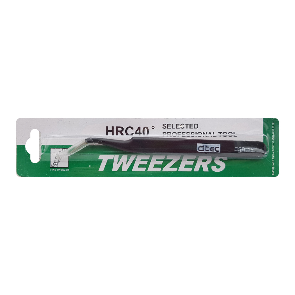 پنس ESD-15 با نوک سوزنی شکل با برند DTEC داری قابلیت ضد مغناطیسی و آنتی استاتیک، دارای مقاومت در برابر خورده شدن، ضد زنگ در اثر رطوبت، طراحی ارگونومی و مقاومت بالا برای گرفتن قطعات و اجسام ریز و ظریف از جملع قطعات الکترونیک SMD و DIP،سر کج با نوک بسیار تیز و باریک،جنس بدنه فولاد آب دیده، طول 123 میلیمتر
