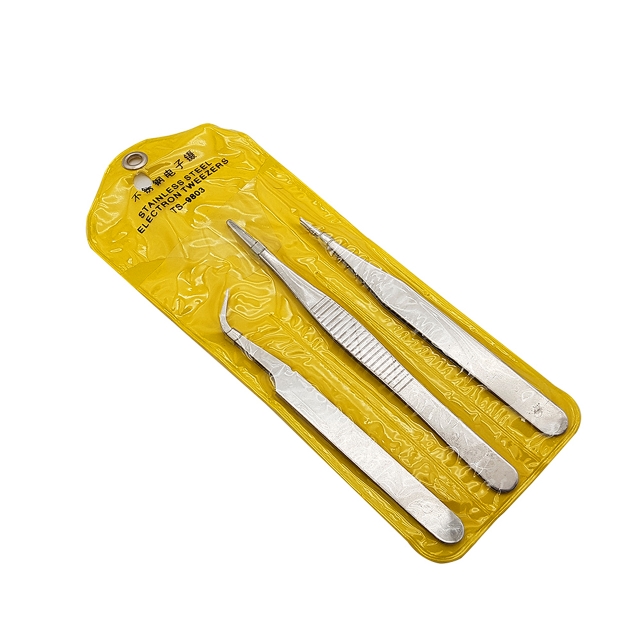 ست پنس 3 تایی (ts-9803) : ابزاری کاربردی برای افرادی که کار ظریف انجام می دهند و با قطعات کوچک سرو کار دارند . این ابزار از دو بازو تشکیل شده که یک طرف دو بازو به یکدیگر متصل و طرف دیگر آزاد است و با فشار آوردن به دو بازو می توان سر پنس را باز و بسته کرد.از پنس برای جابه جایی و جایگذاری قطعات بسیار کوچک مانند قطعات الکترونیکی SMD استفاده می شود .